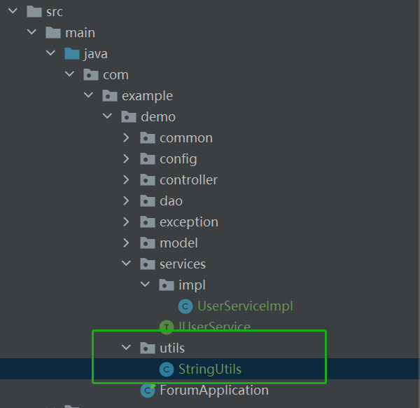 可以看到我们需要多次使用到非空校验的判断,因此我们可以将此处的语句抽取出来,放在一个公共的工具类中。在 demo 包下新建包 utils,在 utils 包下新建类 StringUtils: