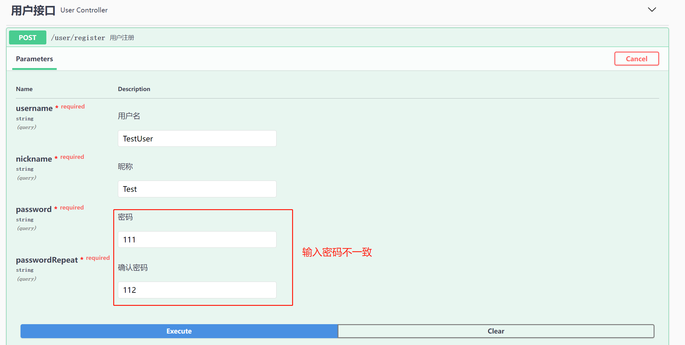 | passwordRepeat | 确认密码 | String | 必须,与密码相同 |