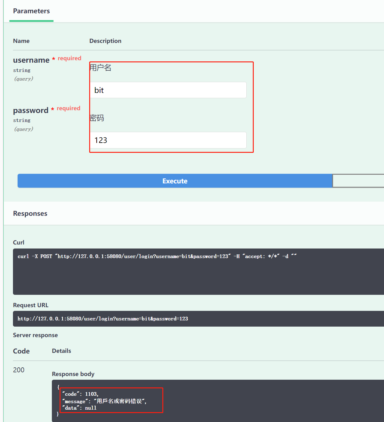 启动程序,访问 API 页面 login 接口,分别提交错误和正确的用户名密码进行测试: