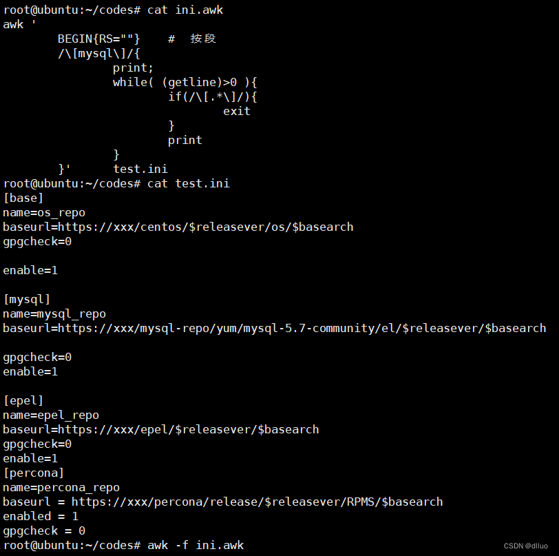 BEGIN{RS=""}:在处理输入之前,将输入记录分隔符RS设置为空字符串。这样设置可以使awk将空行作为记录分隔符,从而将文件中的每个段落作为一个记录。 -