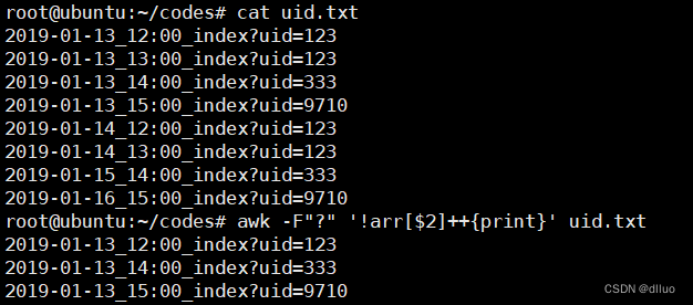 !arr[$2]++:如果数组中指定的索引值为0,则条件成立(即之前没有出现过该索引值)。 -