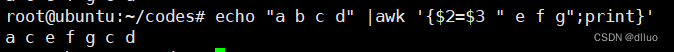 $2表示当前处理的行的第二个字段(使用空格分隔的字段),即"b"。$2=$2" e f g"的意思是将第二个字段(即"b")与"e f g"连接起来,形成"b e f g"。 -
