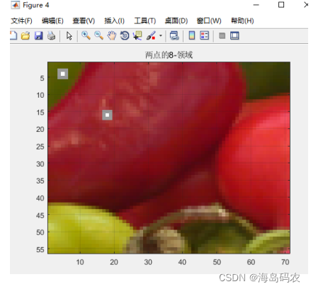 - 使用函数imcrop截取图像中指定区域的一小块图像,然后在这一小块图像中选取两个像素点,通过罗森菲尔德邻域计算方法,对这两个像素点的8-邻域分别进行赋值以显示各像素点的8-邻域,然后通过函数image将修改过两点8-邻域像素值后的小块图像在图像窗口显示;