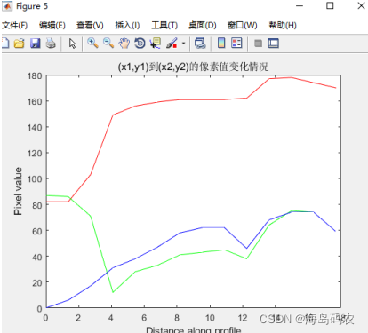- 通过计算推导可以得出小块图像中的像素点(row,col)在原本RGB图像中的坐标为(y+row,x+col),x,y为截取小块图像时指定区域的左上角的坐标值,使用上述计算方法得出的两点的坐标,利用函数imprifile获得从(x1,y1)与(x2,y2)两点间的图像像素变化情况并在图像窗口显示;