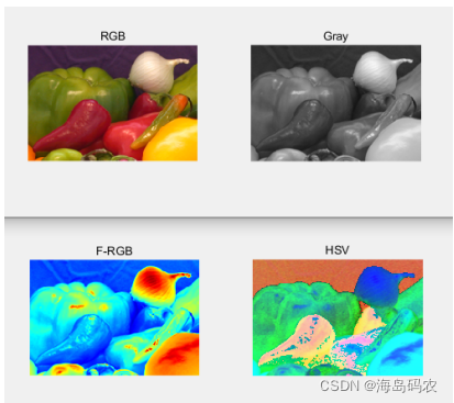 - 使用函数rgb2hsv处理RGB图像获得HSV图像,先使用函数gray2ind将灰度图像转换为索引图像,然后使用函数ind2rgb处理索引图像获得伪彩色图像,最后使用函数subplot将图像窗口分块,然后使用函数imshow在图像窗口中分别显示灰度、彩色、伪彩色和HSV图像;