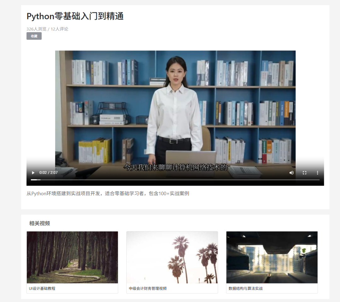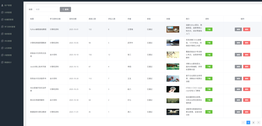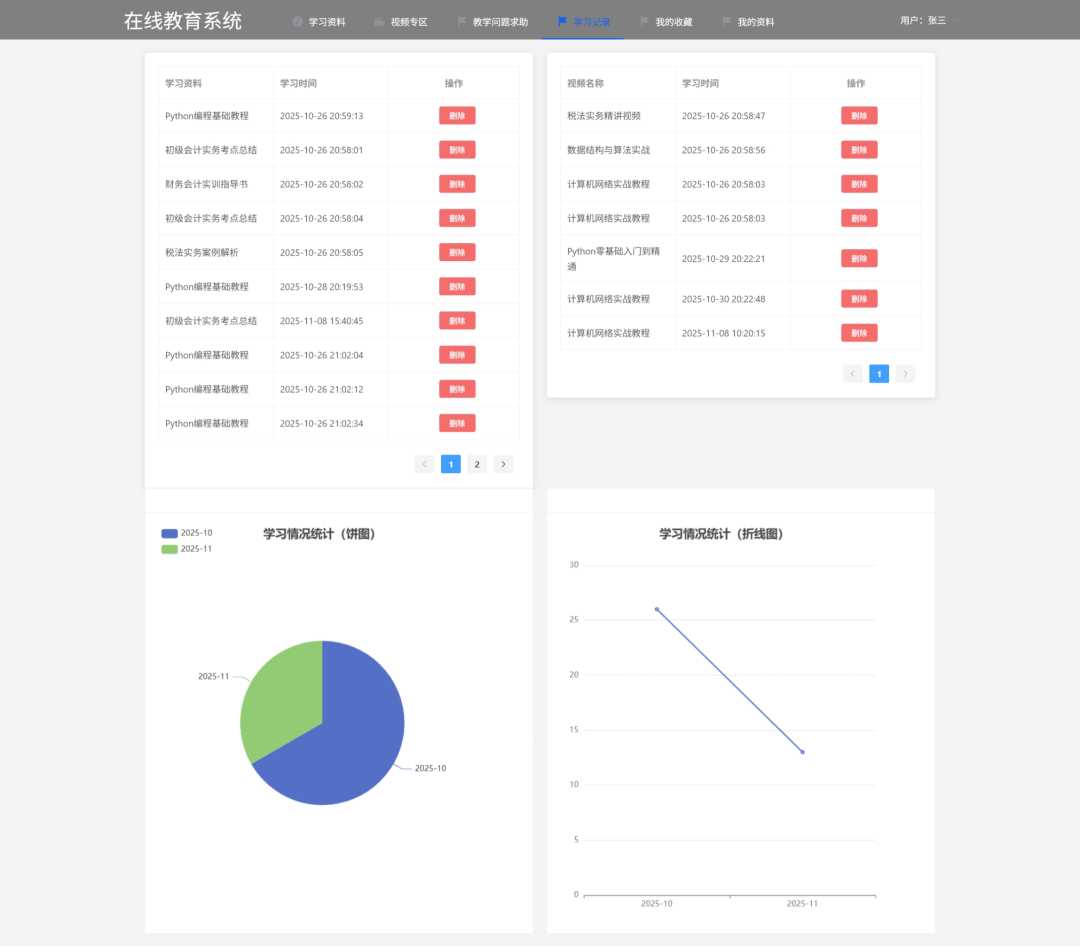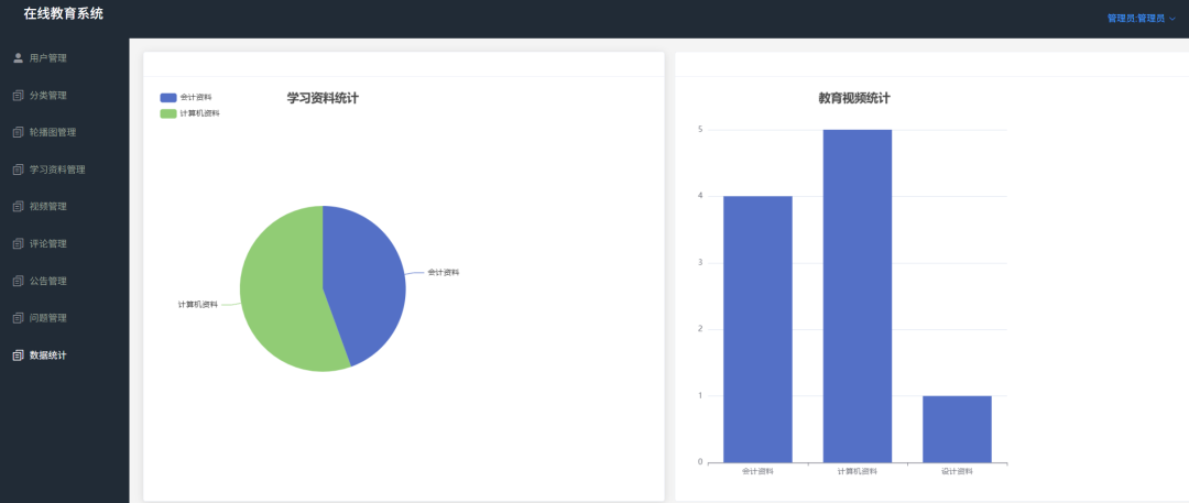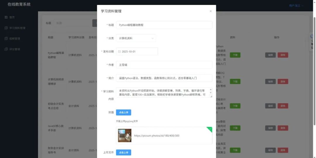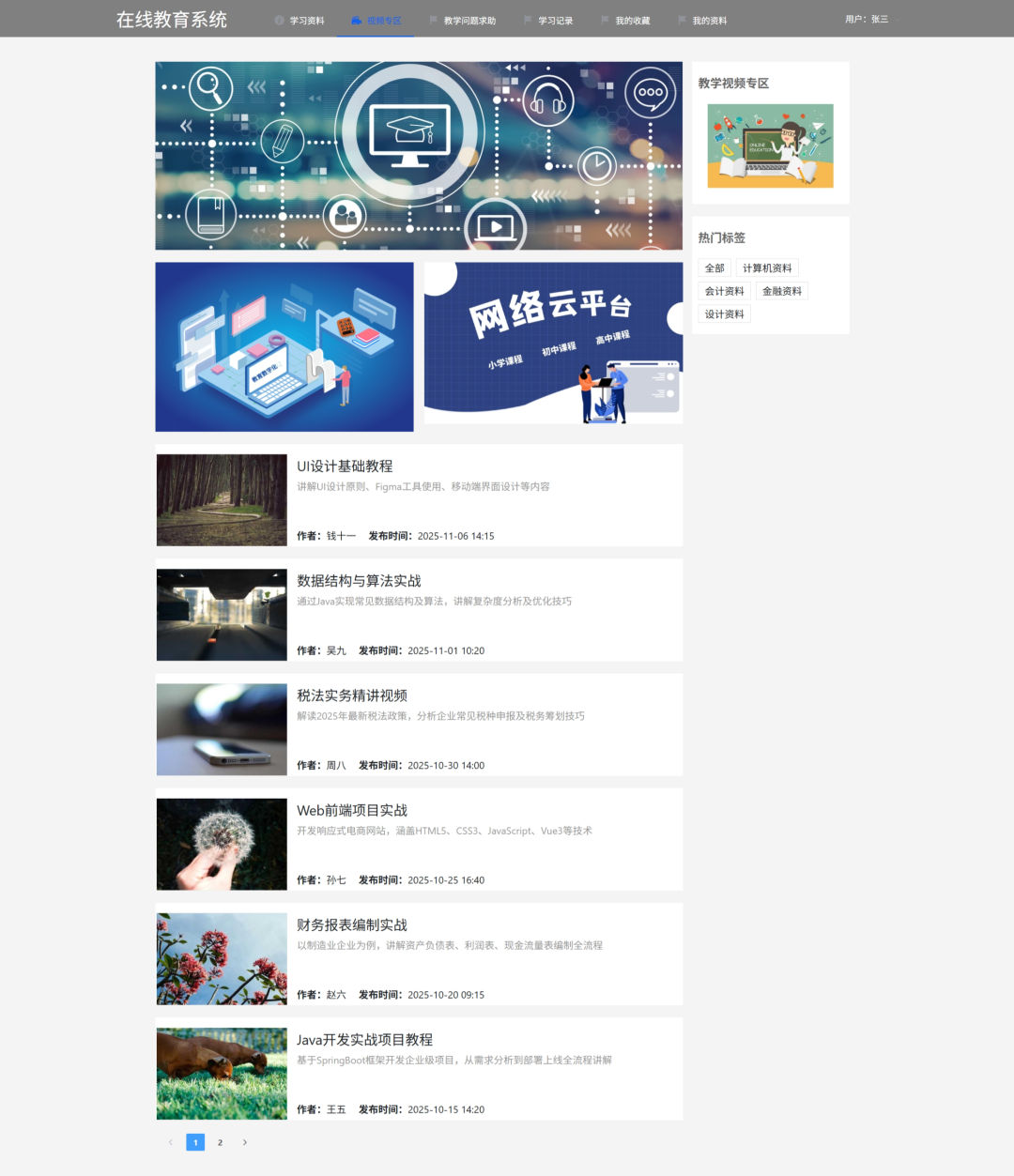 主要功能介绍:本设计通过SpringBoot框架完成后端接口设计,通过Vue完成前端开发。在线教育系统分用户和管理员角色使用,系统功能包括了在线学习课程资料、在线查看教学视频、对一些适用的学习资源可收藏。用户在每一次完成学习后都将生成自己的学习记录,学习记录可用于生成用户的学习数据统计。在系统的后端中,提供发布和管理学习资源的权限,由用户发布的学习资源需要管理员审核才可进行公开展示。另外,系统中为了方便用户学习,也提供了学习资源附件的上传和下载。对于学习文件可直接上传至系统,其他学习者也可以直接下载适用。