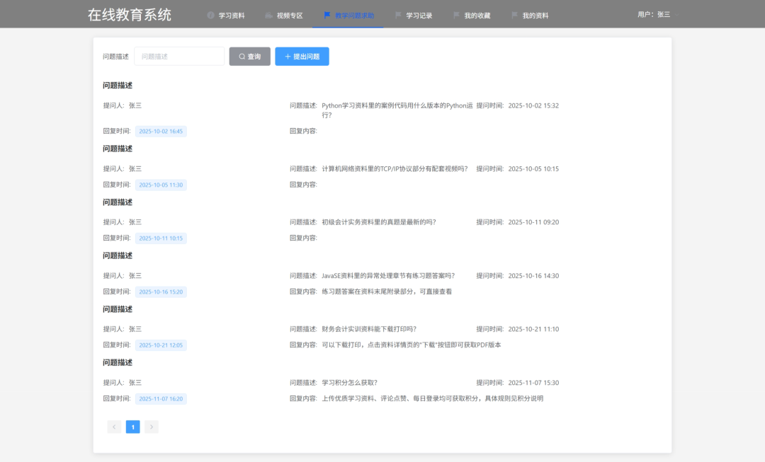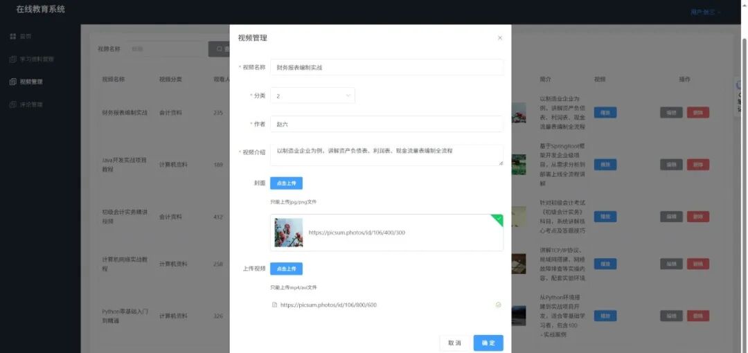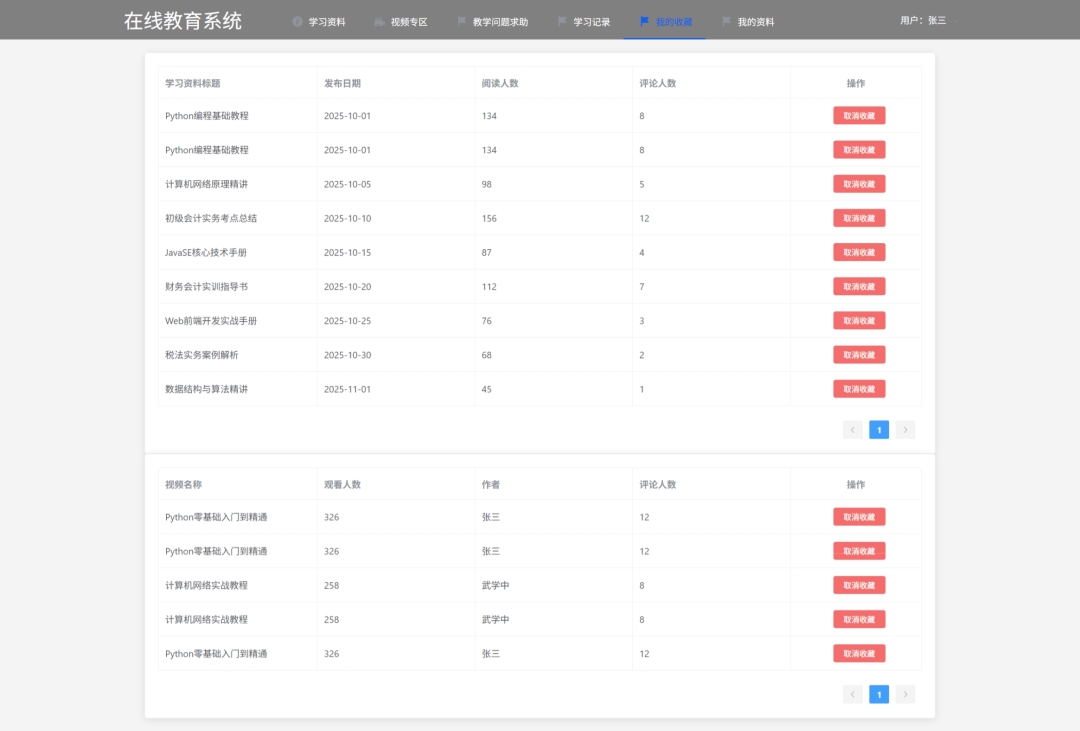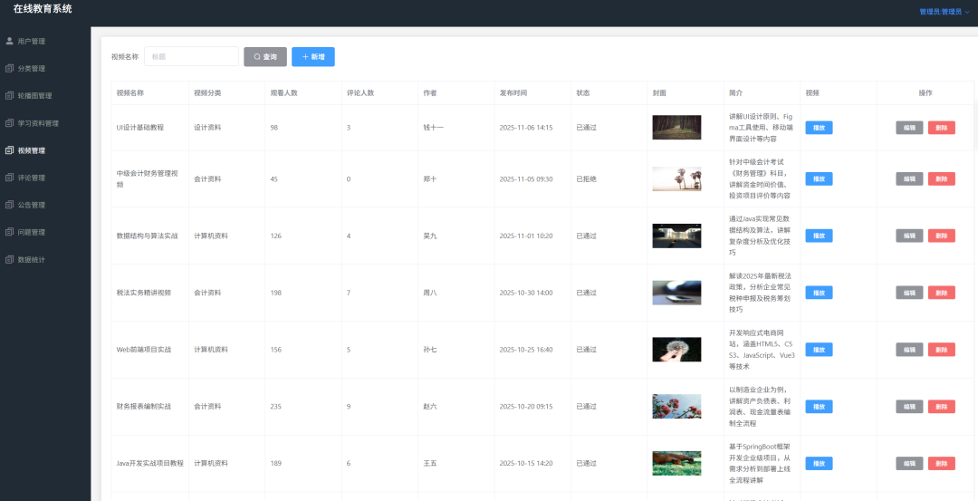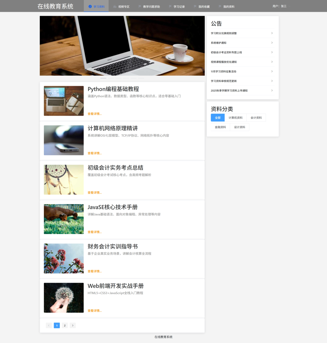 主要功能介绍:本设计通过SpringBoot框架完成后端接口设计,通过Vue完成前端开发。在线教育系统分用户和管理员角色使用,系统功能包括了在线学习课程资料、在线查看教学视频、对一些适用的学习资源可收藏。用户在每一次完成学习后都将生成自己的学习记录,学习记录可用于生成用户的学习数据统计。在系统的后端中,提供发布和管理学习资源的权限,由用户发布的学习资源需要管理员审核才可进行公开展示。另外,系统中为了方便用户学习,也提供了学习资源附件的上传和下载。对于学习文件可直接上传至系统,其他学习者也可以直接下载适用。