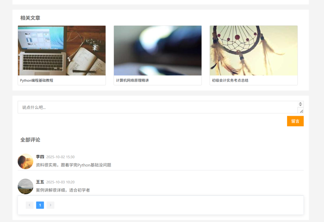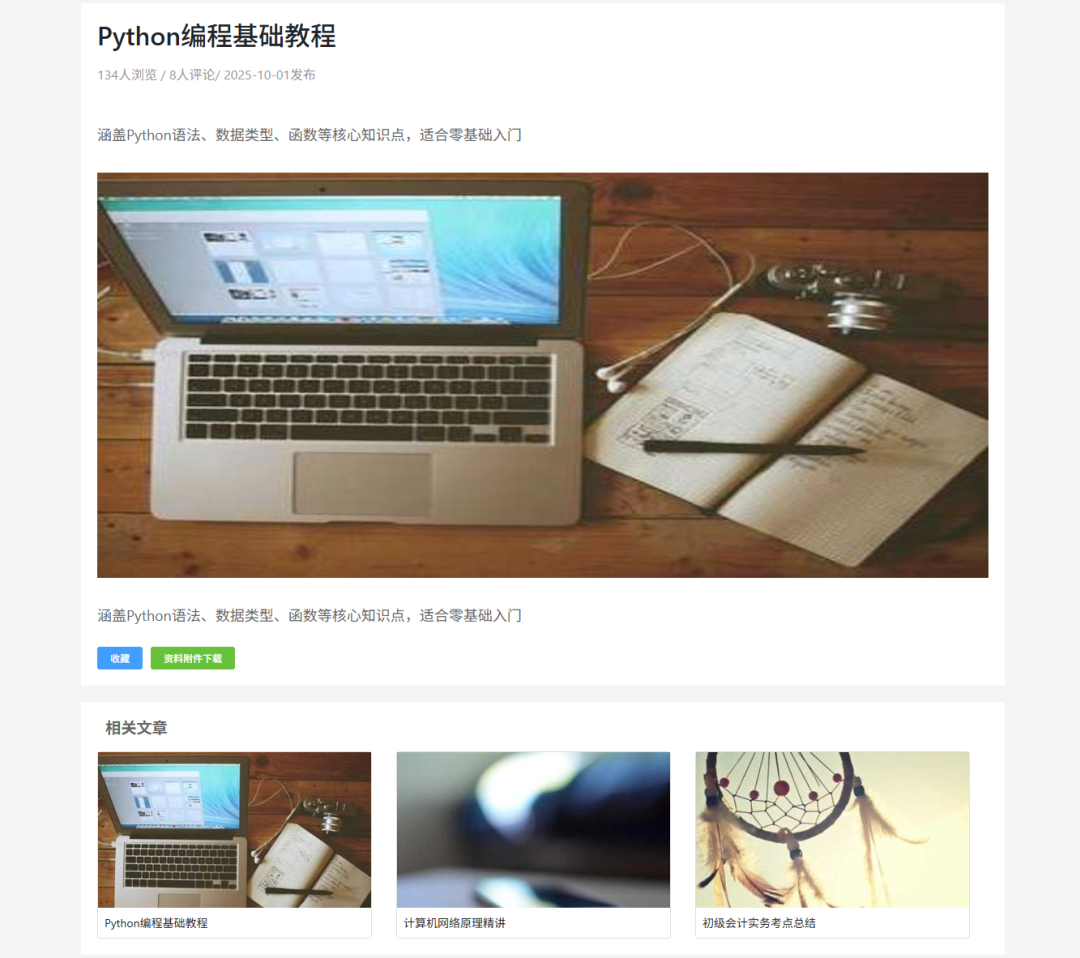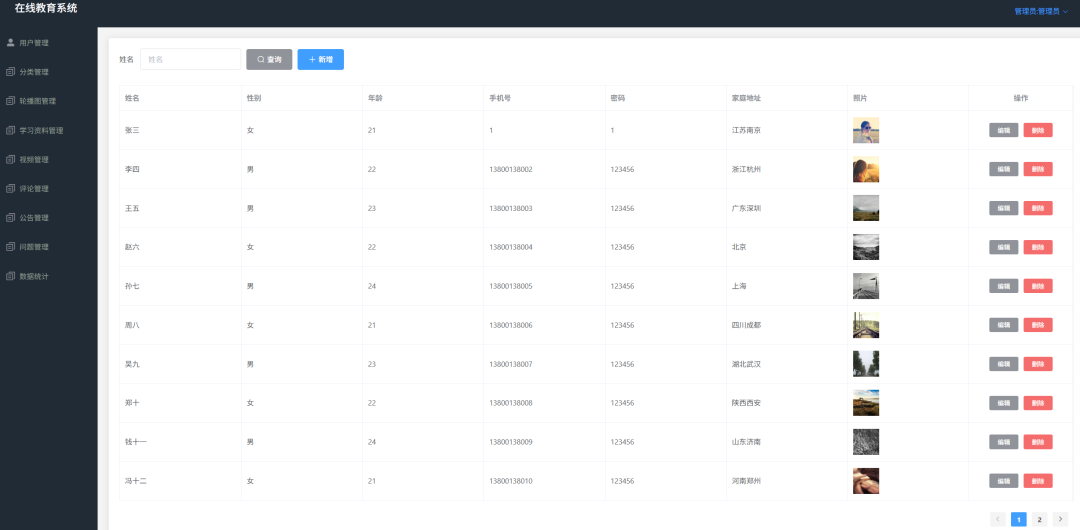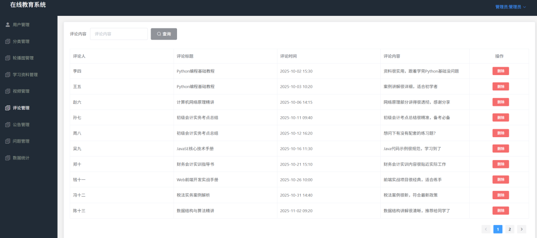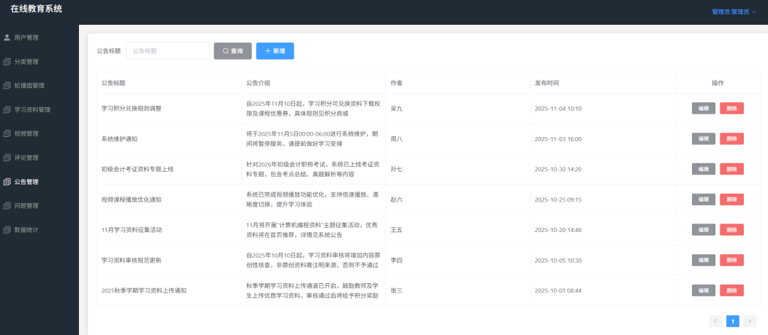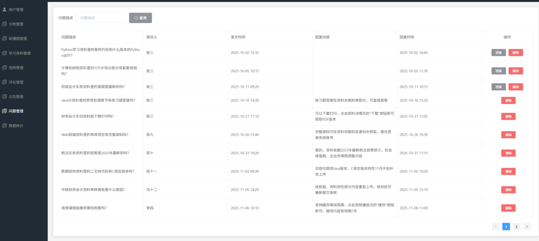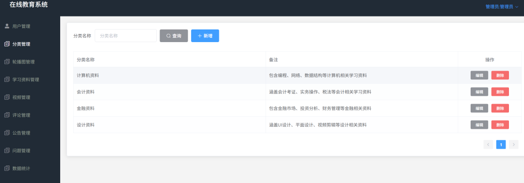 主要功能介绍:本设计通过SpringBoot框架完成后端接口设计,通过Vue完成前端开发。在线教育系统分用户和管理员角色使用,系统功能包括了在线学习课程资料、在线查看教学视频、对一些适用的学习资源可收藏。用户在每一次完成学习后都将生成自己的学习记录,学习记录可用于生成用户的学习数据统计。在系统的后端中,提供发布和管理学习资源的权限,由用户发布的学习资源需要管理员审核才可进行公开展示。另外,系统中为了方便用户学习,也提供了学习资源附件的上传和下载。对于学习文件可直接上传至系统,其他学习者也可以直接下载适用。