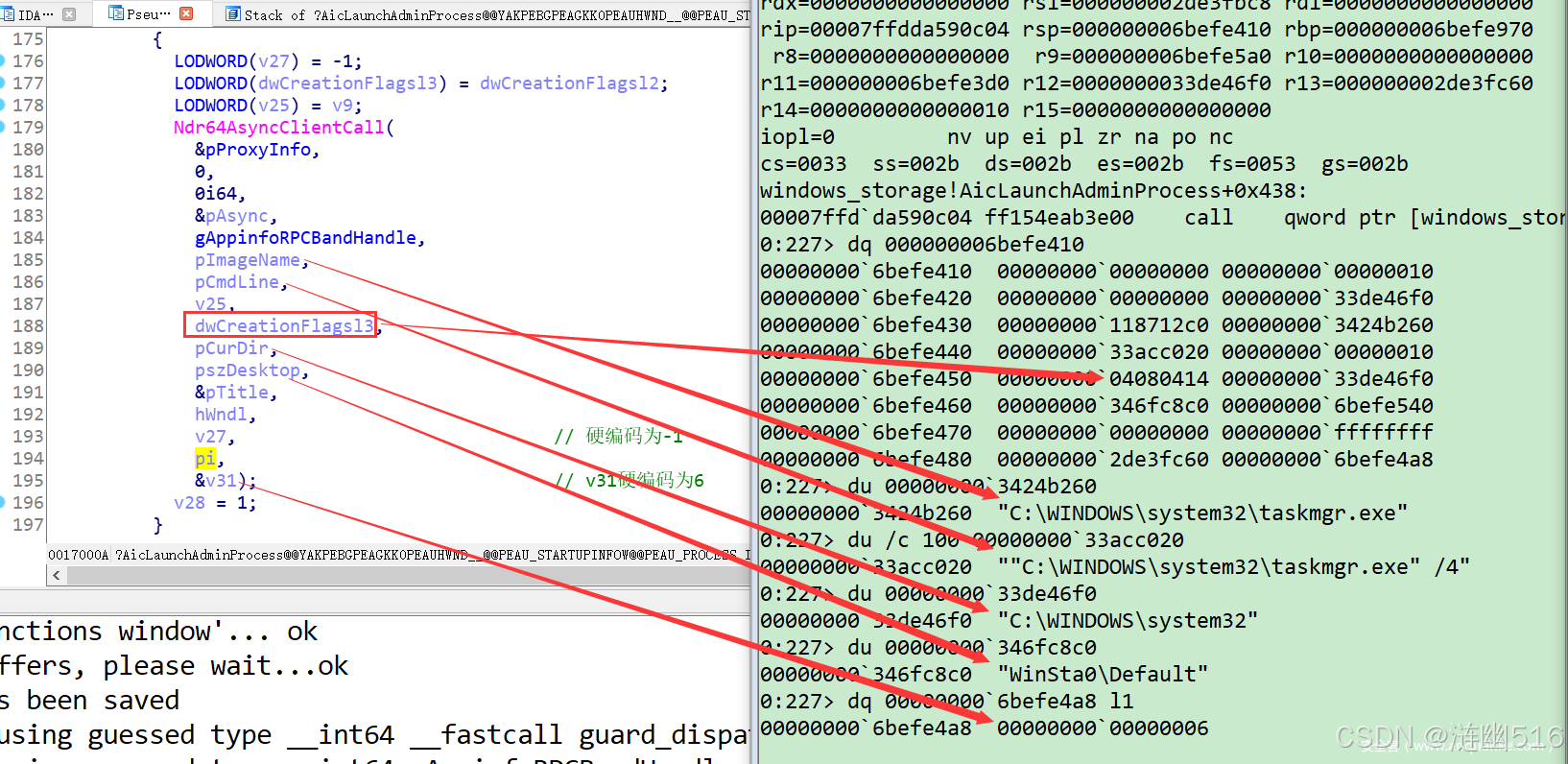 圈起来的第一个是权限令牌。后面几个参数分别是:第一个字符串开头在这段内存中的偏移量,第二个字符串开头在这段内存中的偏移量,后面的字符串组开头在这段内存中的偏移量,以及字符串组结尾在这段内存中的偏移量。对于 exe 来说,前两个字符串在我观察到的情况中总保持一致,是文件路径,因此并不能很好地区分。而最后的字符串数组是其参数列表。