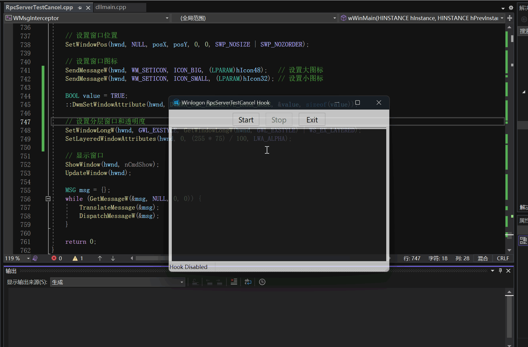 通过对 RpcServerTestCancel 热补丁【不需要使用 Detours 和 Dll 模块注入】可以拦截有关 Rpc 操作(这里以不判断参数,直接拦截所有 WMsg 为例,注意:这会导致所有跟 winlogon 有关的系统操作都被禁止,虽然不影响正常运行,但可能会造成睡眠后出现异常,所以,此代码需要和 Buffer 参数解析联合使用)。