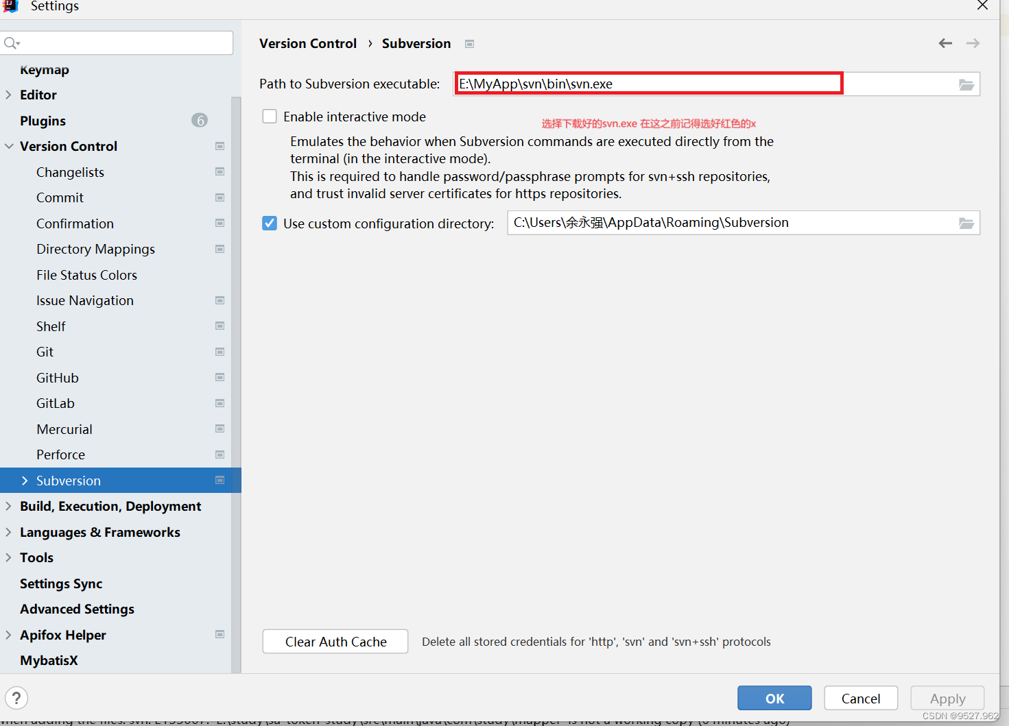 第二步:在idea中的Settings中找到该页面,选择好下载的svn中bin中的svn.exe