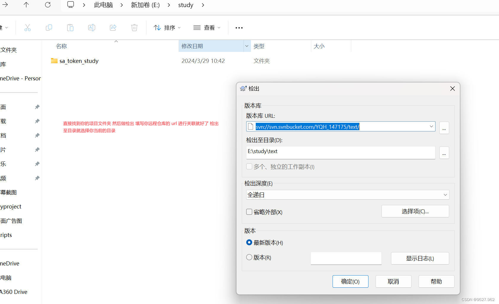 第五步:找到你需要关联的文件夹地址 右击——TortoiseSVN——检出复制你的URL,检出目录就选择当前目录 这一步做完idea就关联好你svn仓库了