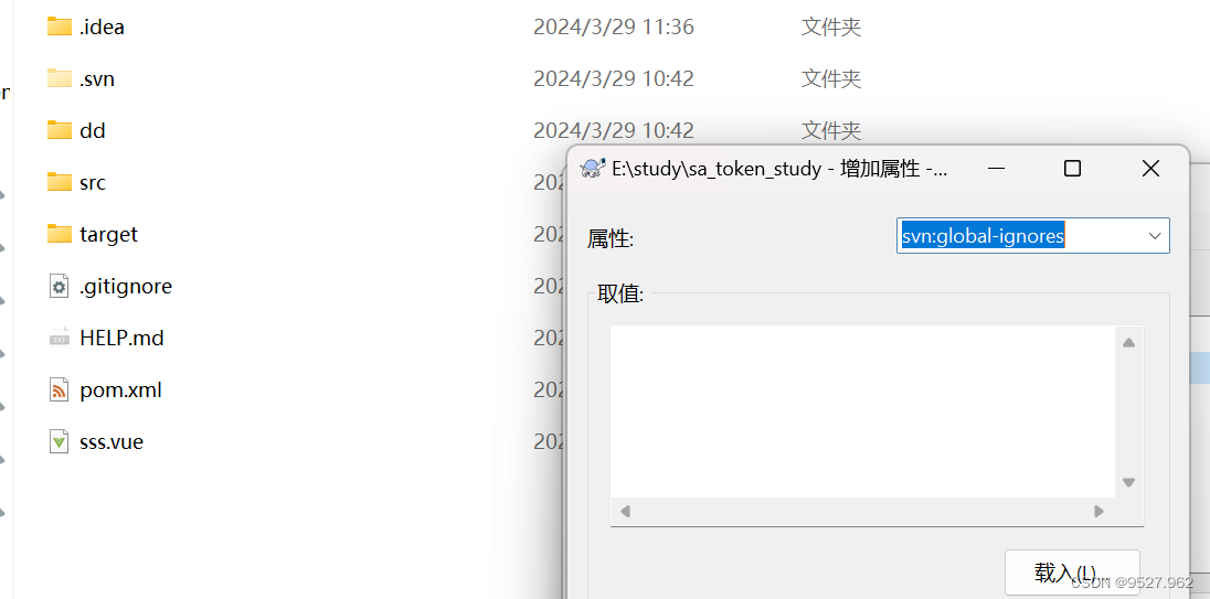 步骤 : 找到需要忽略文件的文件夹 右击——TortoiseSVN——属性——新建——其他——属性选择svn:global-ignores——取值直接选择复制上方忽略文件一直点确定就ok了