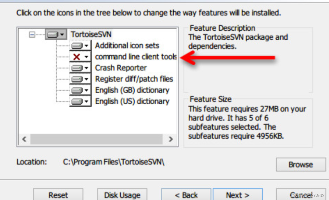 第一步:在下载SVN小海龟的时候 记得勾选红色 X 下拉列表中的第一个不然idea找不到svn.exe