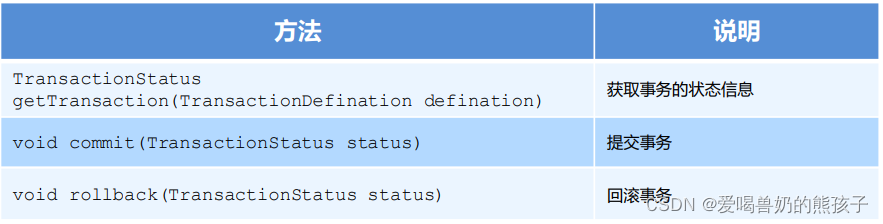 PlatformTransactionManager 接口是 spring 的事务管理器,它里面提供了我们常用的操作事务的方法。