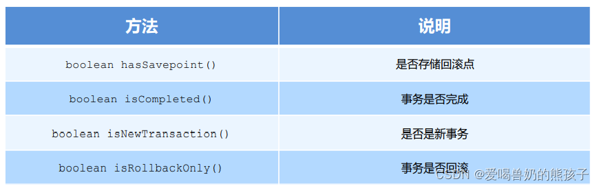 TransactionStatus 接口提供的是事务具体的运行状态,方法介绍如下。