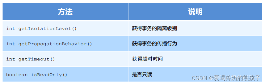 TransactionDefinition 是事务的定义信息对象,里面有如下方法: