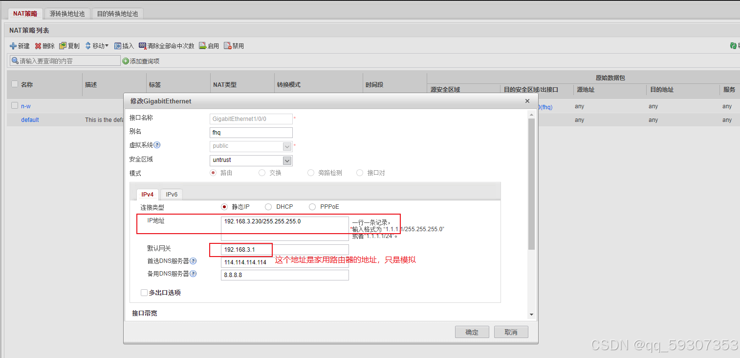 ③配置NAT,使得PC端可以上网,记得下面把ping✔打开,防止PC端ping不通