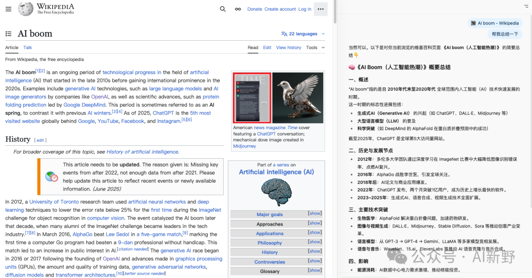 它能理解当前页面的内容,你可以让它总结文章、解释概念等等,这个功能基本上每款AI浏览器都有,所以没啥好稀奇的。