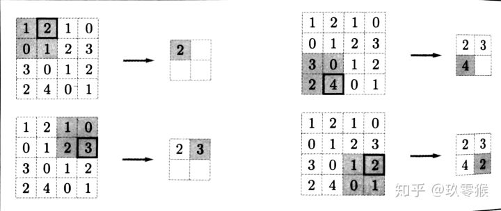 池化操作也有一个类似卷积核一样东西在特征图上移动,书中叫它池化窗口,所以这个池化窗口也有大小,移动的时候有步长,池化前也有填充操作。因此,池化操作也有核大小f、步长s和填充p 参数,参数意义和卷积相同。Max池化的具体操作如下(池化窗口为2 × 2 ,无填充,步长为2):