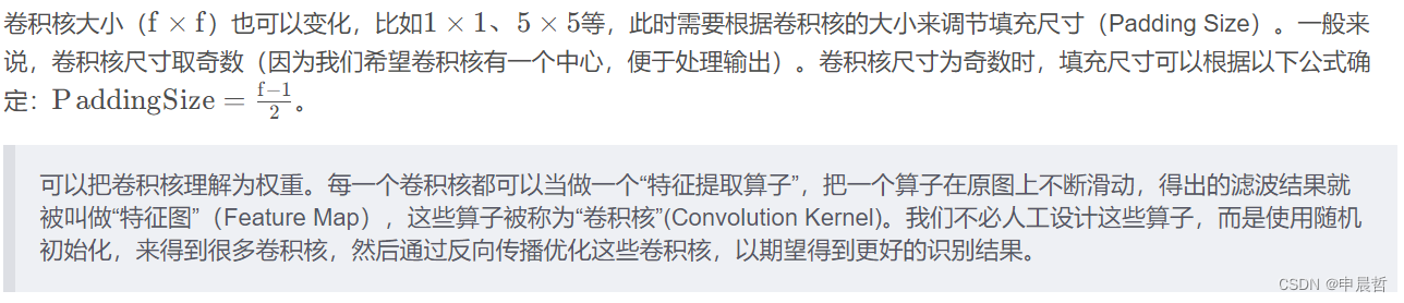 - 若希望输出尺寸比输入尺寸小很多,可以采取增大步幅的措施。但是不能频繁使用步长为2,因为如果输出尺寸变得过小的话,即使卷积核参数优化的再好,也会必可避免地丢失大量信息;