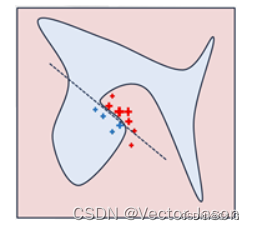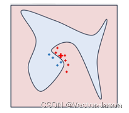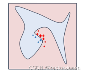 如上图是一个非线性的复杂模型,蓝/粉背景的交界为决策函数;