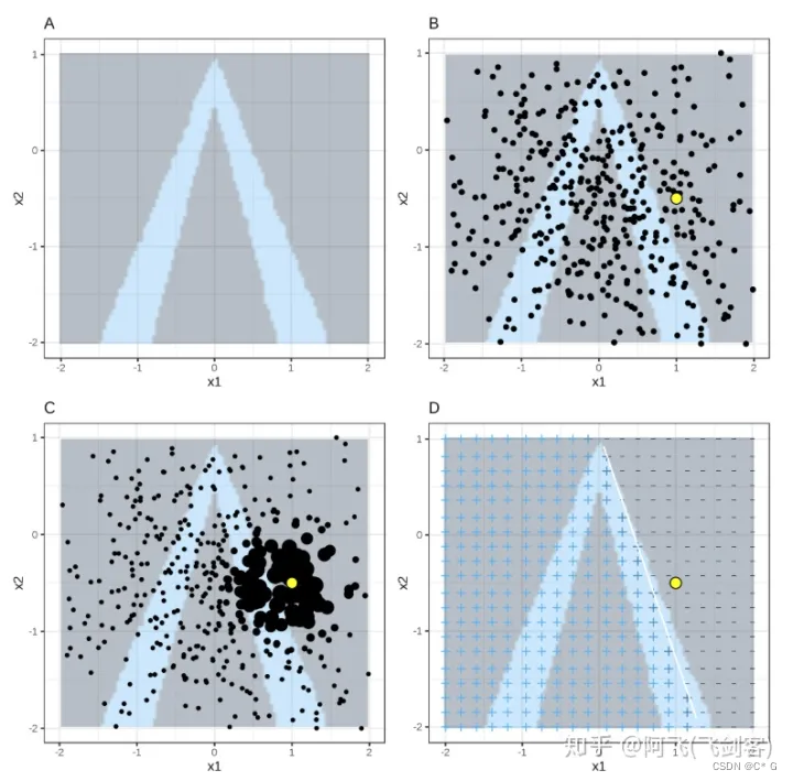 其中,背景灰色为负例,背景蓝色为正例,黄色为兴趣点,小粒度黑色点为采样点,大粒度黑点为邻域范围,右下图为LIME的结果。