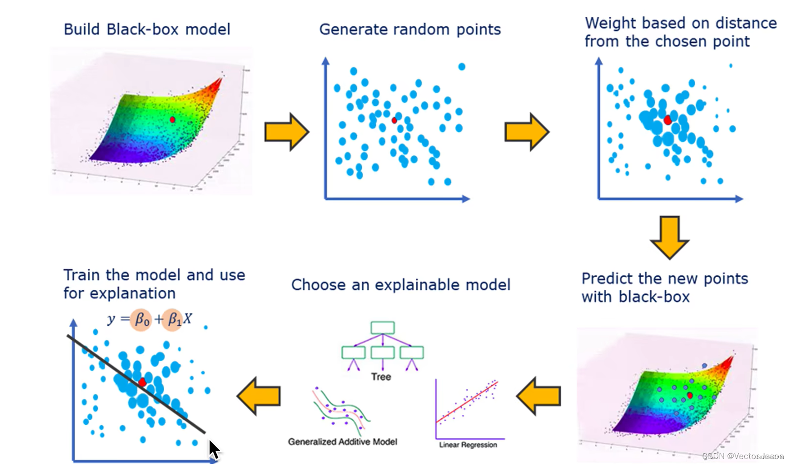 首先,在待解释的模型中取一个待解释样本,之后随机生成扰动样本,并以与待解释样本的距离作为标准附加权重,再将得到的结果作为输入投入待解释模型中,同时选择在局部考察的待训练可解释模型(如决策树、逻辑回归等等),最终即可训练出在可解释特征维度上的可解释性模型。
