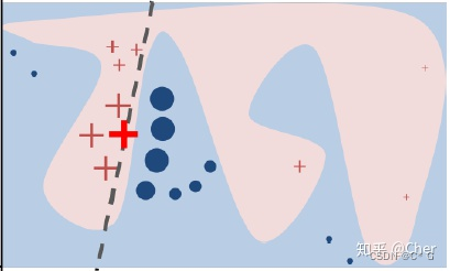 在该样本点周围进行扰动采样(细线的红色十字叉),按照它们到X的距离赋予样本权重;