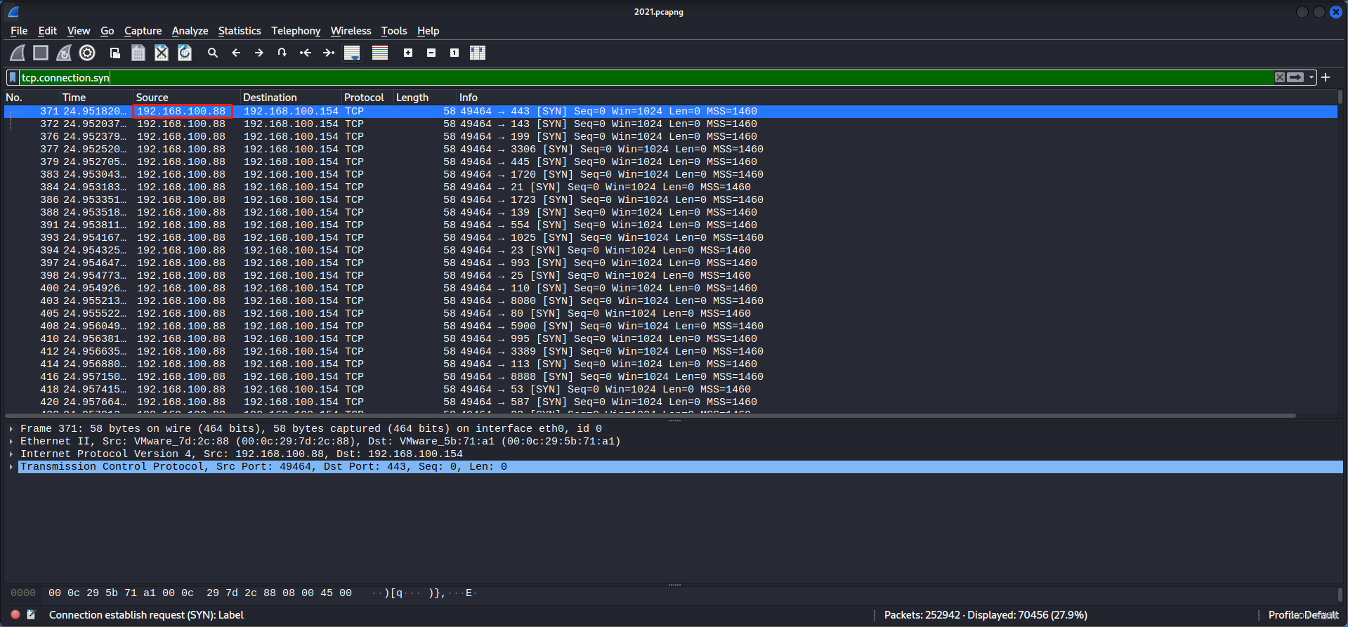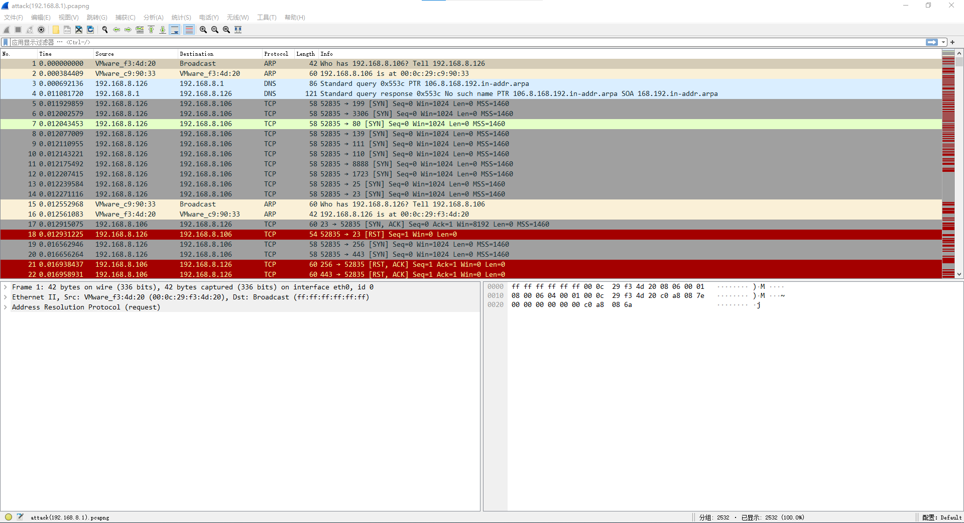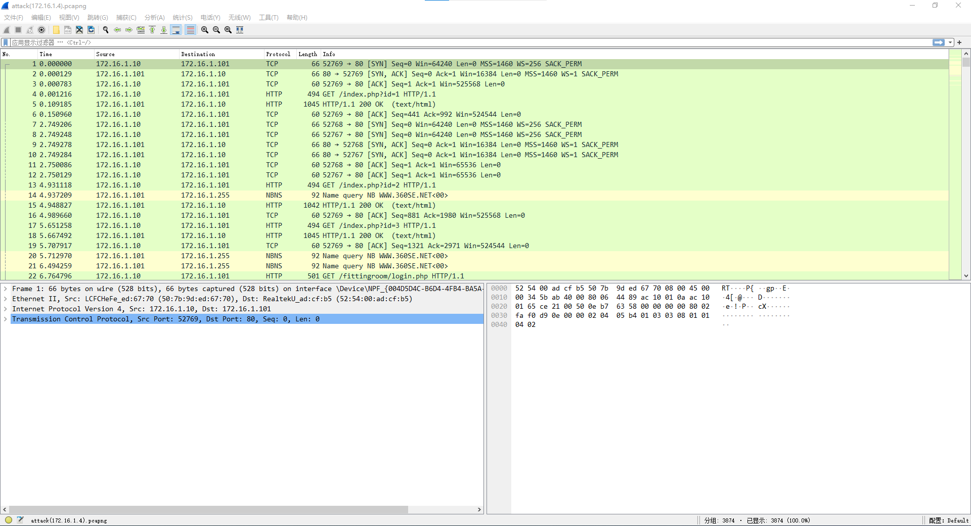 attack(1).pcapng解析 1.使用 Wireshark 查看并分析 WindowsXP 桌面下的 attack.pcapng 数据包文件,通过分析数据包 attack.pcapng 找出黑客的 IP 地址,并将黑客的 IP 地址作为 FLAG(形式:[IP 地址])提交;2.继续查看数据包文件 attack.pacapng,分析出黑客扫描了哪些端口,并将全部的端口作为 FLAG(形式:[端口名 1,端口名 2,端口名 3…,端口名 n])从低到高提交;