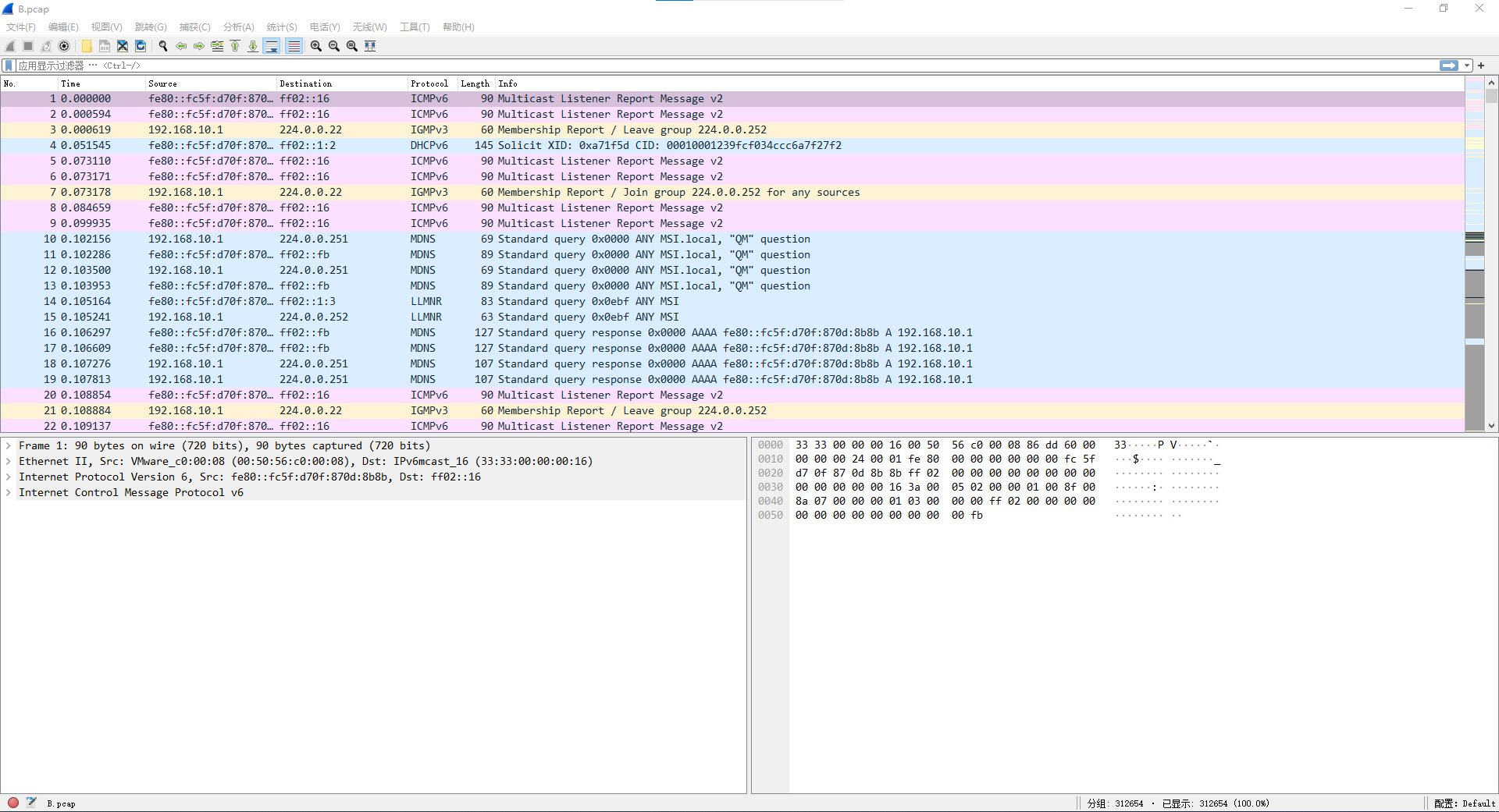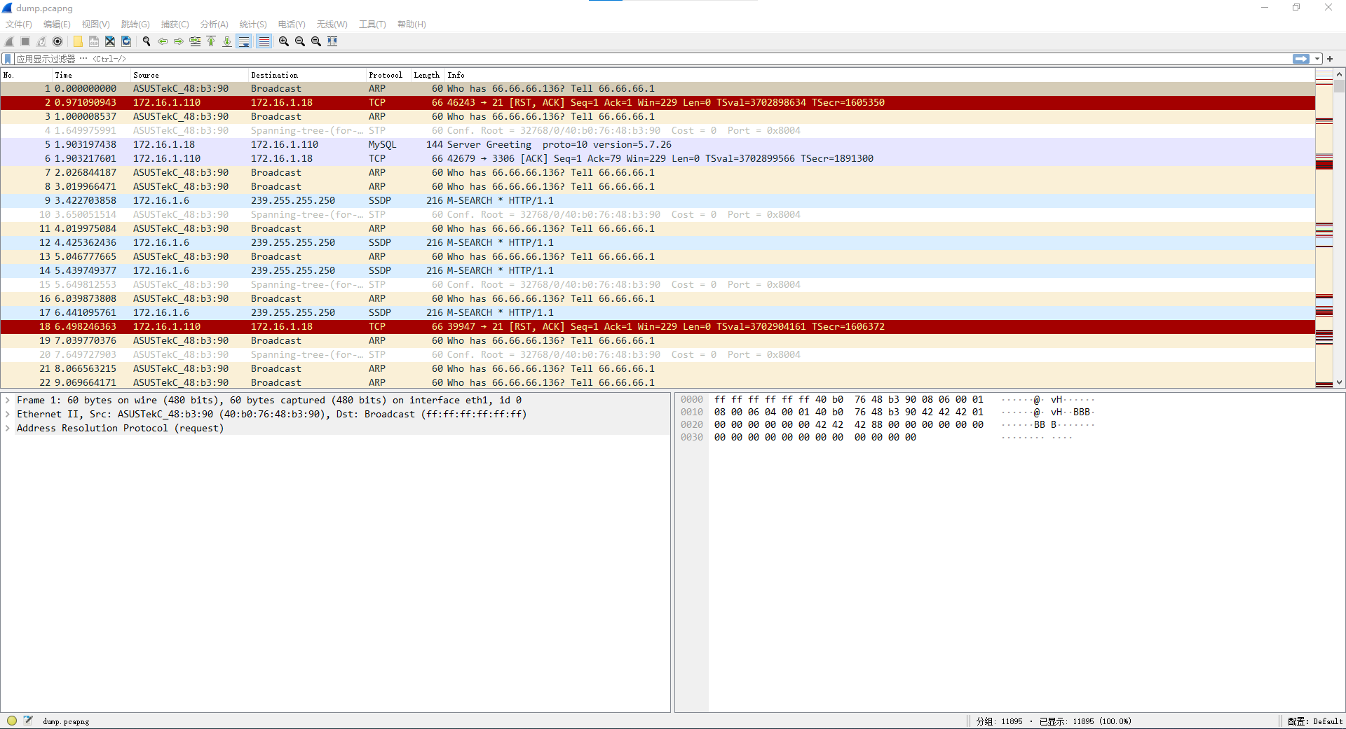 dump.pcapng解析 1.某公司网络系统存在异常,猜测可能有黑客对公司的服务器实施了一系列的扫描和攻击,使用Wireshark抓包分 析软件查看并分析Kali Linux的root目录下dump.pcapng数据包文件,找到黑客的IP地址,并将黑客的IP地址作 为Flag值(如:172.16.1.1)提交;5.继续分析数据包文件dump.pcapng,黑客可能找到异常用户后再次对目标服务器的某个服务进行了密码暴力枚 举渗透,成功破解出服务的密码后登录到服务器中下载了一张图片,将图片文件中的英文单词作为Flag值提交。