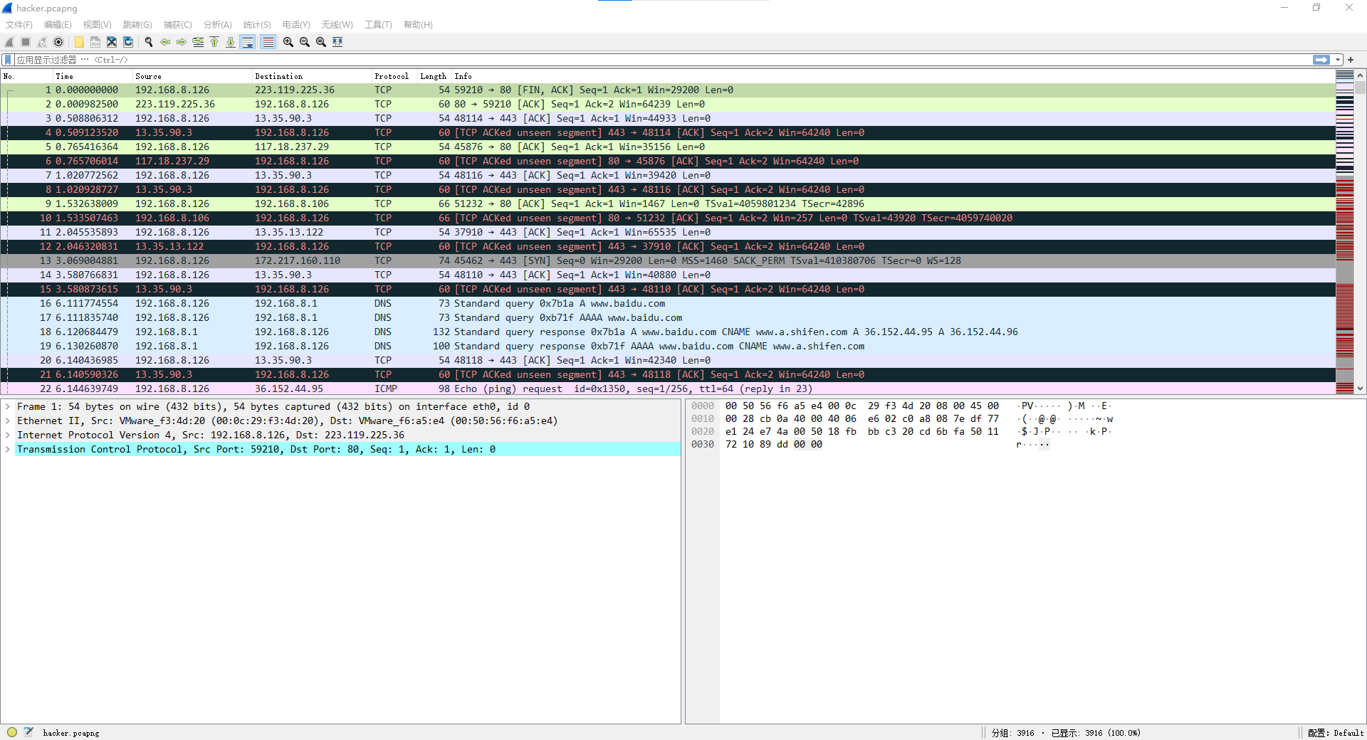 hacker.pcapng解析 1.从靶机服务器的 FTP 上下载 hacker.pcapng 数据包文件,通过分析数据包 hacker.pcapng 找出黑客的 IP 地址,并将黑客的 IP 地址作为 FLAG(形式:[IP 地址])提交;2.继续查看数据包文件 hacker.pacapng,分析出黑客扫描得到的靶机开放的端口,将开放的端口号中数字最小的端口作为 FLAG(形式: [端口号])提交;7.继续查看数据包文件 hacker.pacapng,分析出黑客获取的内容,并将获取的内容作为 FLAG(形式: [获取的内容])提交。