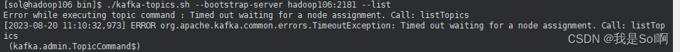 Error while executing topic command : Timed out waiting for a node assignment. Call: listTopics kafka3.0.0版本后取消了--Zookeeper命令,改为了--bootstrap-server所以查询端口号2181超时故应该使用kafka Broker默认端口:9092进行查询。