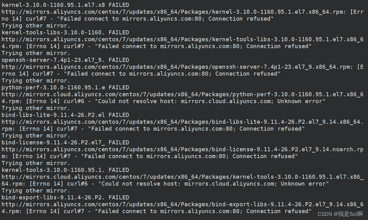 Failed connect to mirrors.cloud.aliyuncs.com:80; Connection refused【拒绝连接】 问题:将yum换成国阿里内镜像源之后更新,一直连接失败。原因:部分yum源失效。