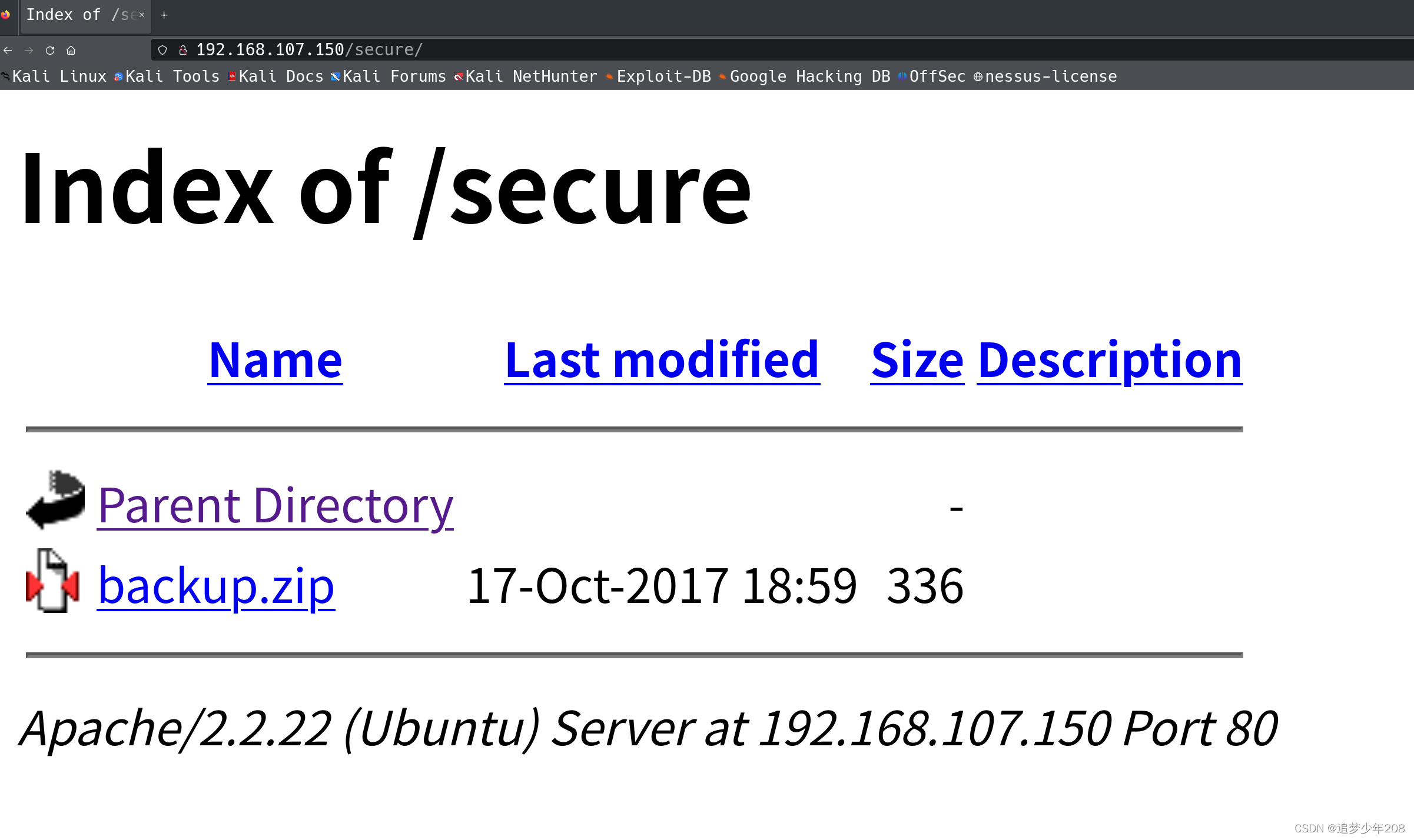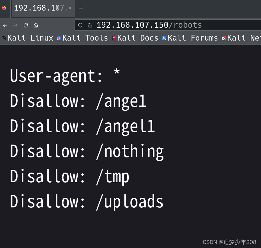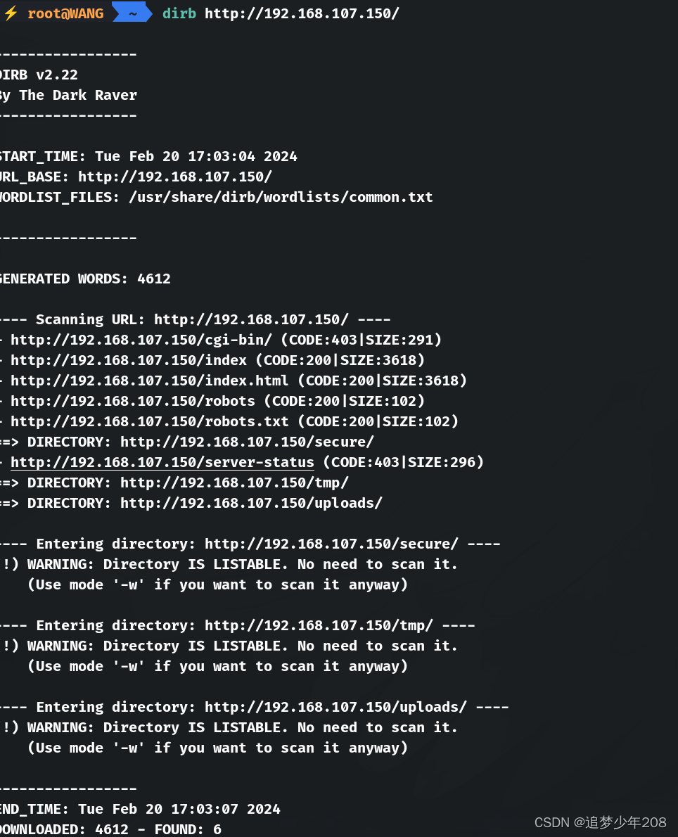 网站浏览了半天啥都没有发现,使用kali自带的网站目录扫描工具dirb进行扫描:dirb http://192.168.107.150/