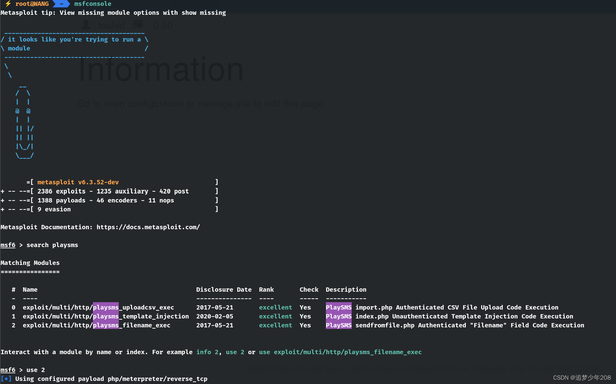 搜索可用漏洞模块:search playsms