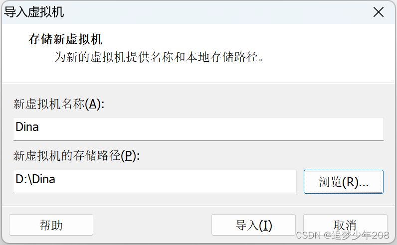 在导入界面为虚拟机命名及存储路径设置