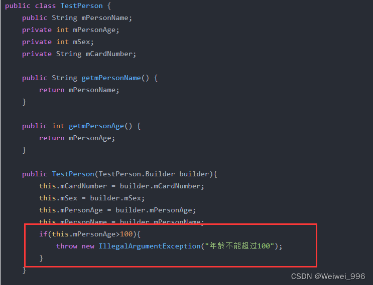 我们对这个属性做了一个限制,因为我们实际使用的时候,肯定会有一些属性有所限制,我们可以直接在这里就对限制做了处理,然后在Builder的时候使用try-catch捕获异常,可以更方便的知道数据是否存在问题。