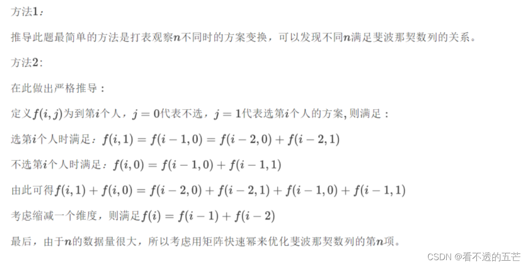 这里我是打表发现斐波那契规律的。对于输入只有一个数或者两个数的题目,我们可以先用类似暴力的方法求出小范围的答案,肉眼观察出答案和输入数据的规律,从而发现公式。这里发先斐波那契规律后,由于n很大,所以必须要用矩阵快速幂优化。矩阵快速幂可以解决f(n)=a*f(n-1)+b*f(n-2)+c*f(n-3)....的问题。当n特别大时可以直接用矩阵快速幂解决。