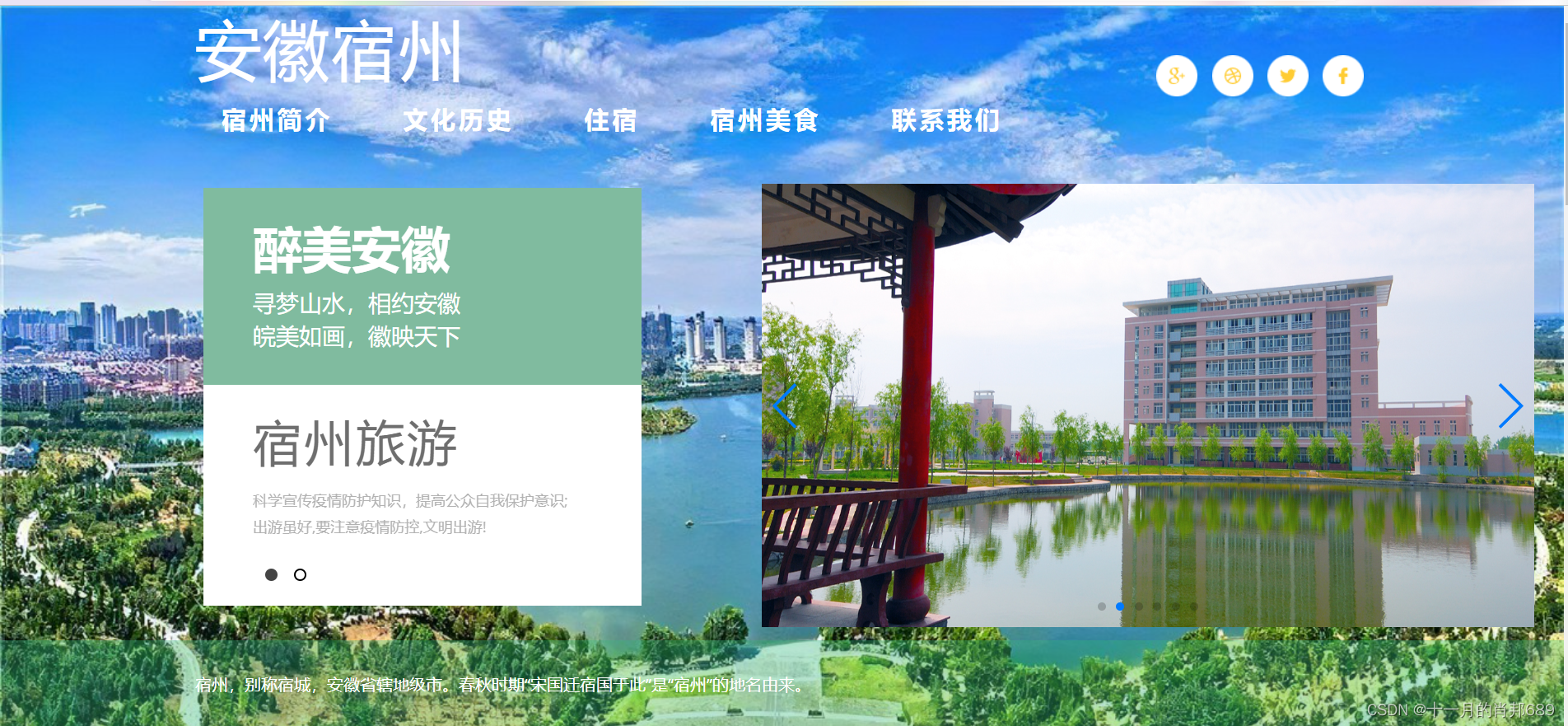 前端模板——家乡风景的介绍 本博客以HTML为主体框架,css修饰内容,JavaScript设置动态特效,引用了jQuery,bootstrap,swiper框架中的一些代码,可供初学者学习。 首页返回顶部的设置 宿州美食宿州民宿 跟着我页面(宿州宣传页面) 联系我们.....................