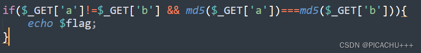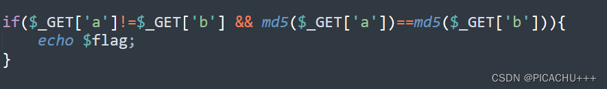 如果上面的“==”变成了“===”就不能成功了,但是仍然可以利用PHP的特性来进行,可以在URL栏中提交a[]=1&b=[]=2成功绕过,因为当我们令MD5函数的参数为一个数组的时候,函数会报错,并返回NULL值,虽然函数的参数时两个不同的数组,但是返回的值都是NULL。