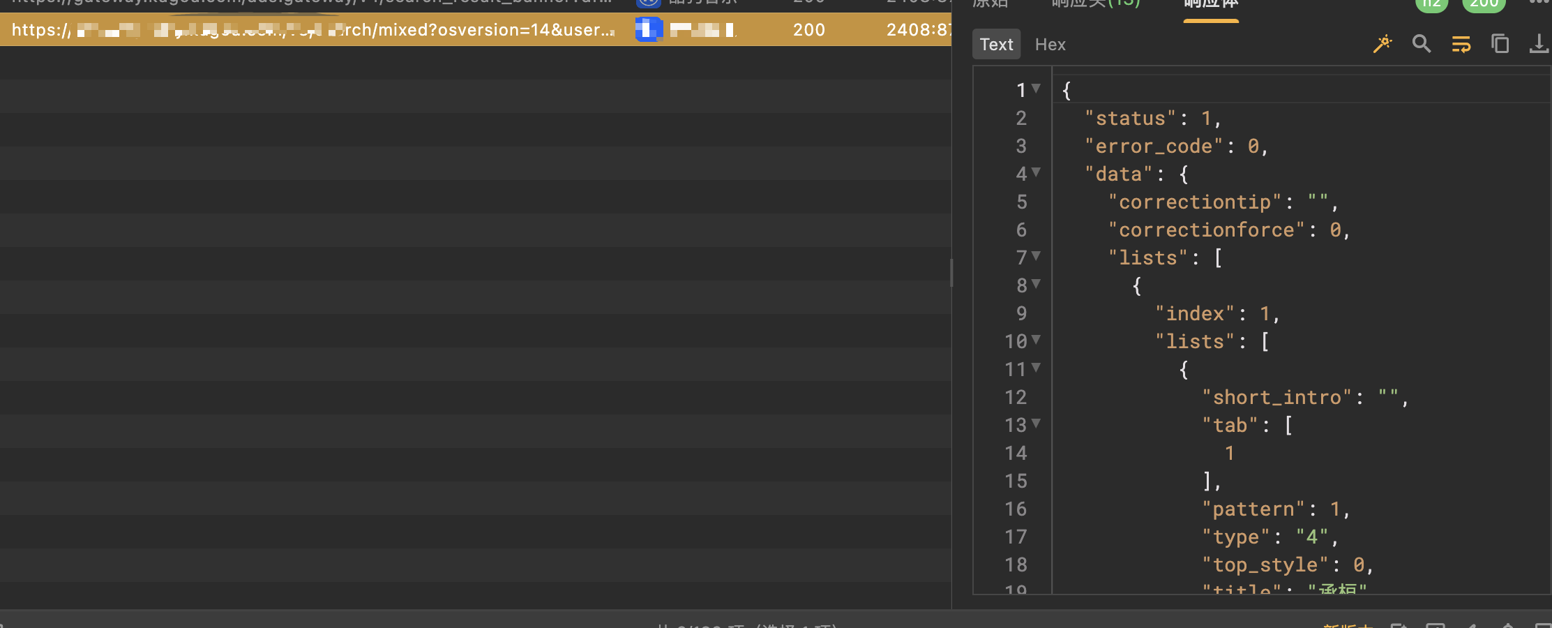 在app中随便输入关键词进行搜索,抓到是这个接口,使用爬虫工具简单构建出一个爬虫代码