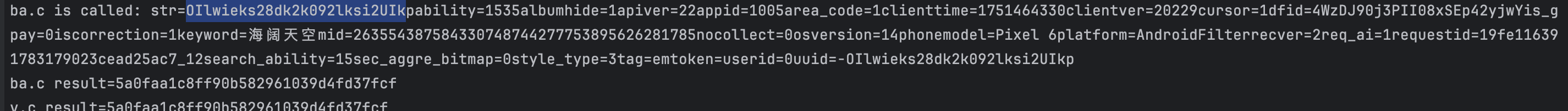 ba.c是一个md5加密的方法,可以简单看出来,是一个盐值加上str加上盐值md5的结果,hook下ba.c