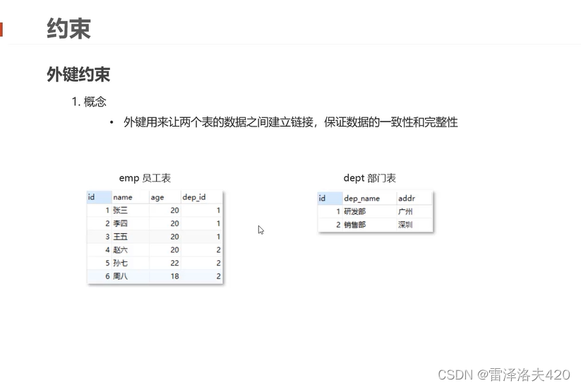SQL外键约束 emp为从表,dept为主表,外键名称为fk_从表名称_主表名称(fk:foreign key),外键字段是从表中的关联列。创建时先创建主表,再创建从表,最后建立联系。删除时,先删除从表数据,再删除主表数据。添加数据时,先添加主表,再添加从表。将逻辑链接转化为物理链接。