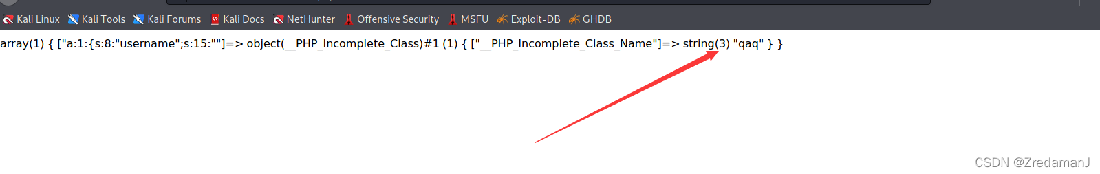 然后会在session_start()返回session会话里面存储数据时,php引擎的反序列化作用下得到了qaq类。这是因为当使用php引擎的时候,php引擎会以|作为作为key和value的分隔符,那么就会将a:1:{s:8:"username";s:15:"作为SESSION的key,将o:3:"qaq":0:{}作为value,进行反序列化,最后就会得到qaq这个类。这也就导致了反序列化漏洞。