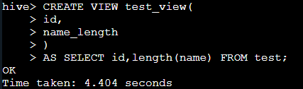 CREATE VIEWS [IF NOT EXISTS] view_name[([COMMENT column_comment],…)][COMMENT view_comment][TBLPROPERTIES (property_name = property_value,…)]AS SELECT …;