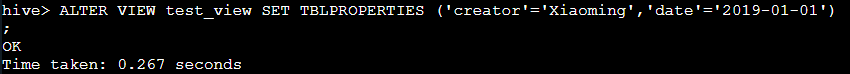 ALTER VIEW test_view SET TBLPROPERTIES ('creator'='Xiaoming','date'='2019-01-01');
