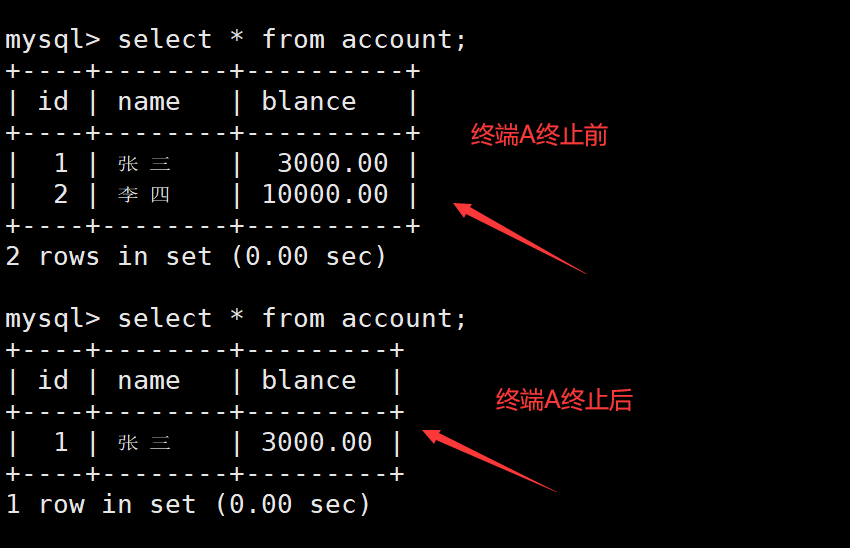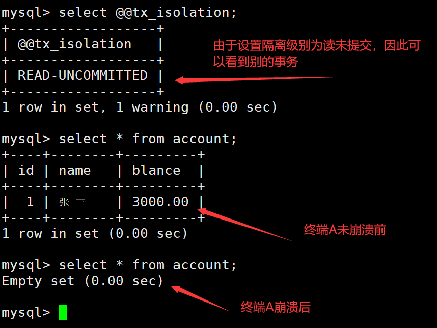 由于终端A的事务未提交就已经崩溃了,因此会自动回滚到事务开启前的状态。