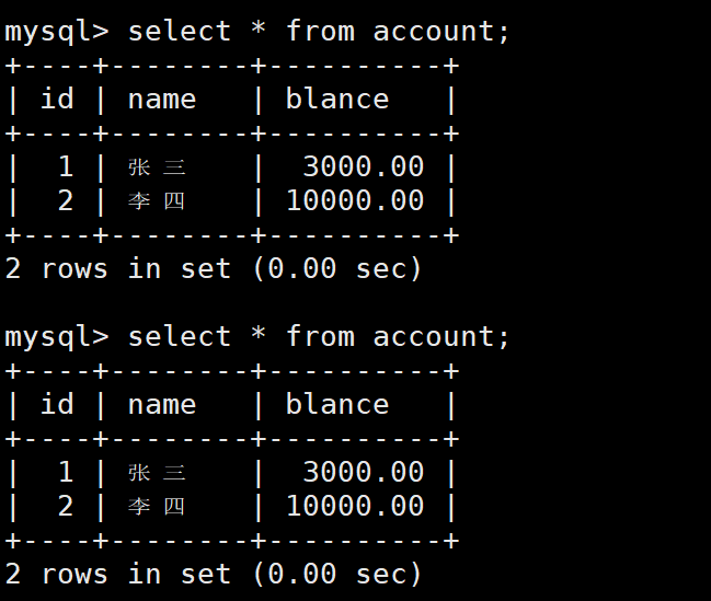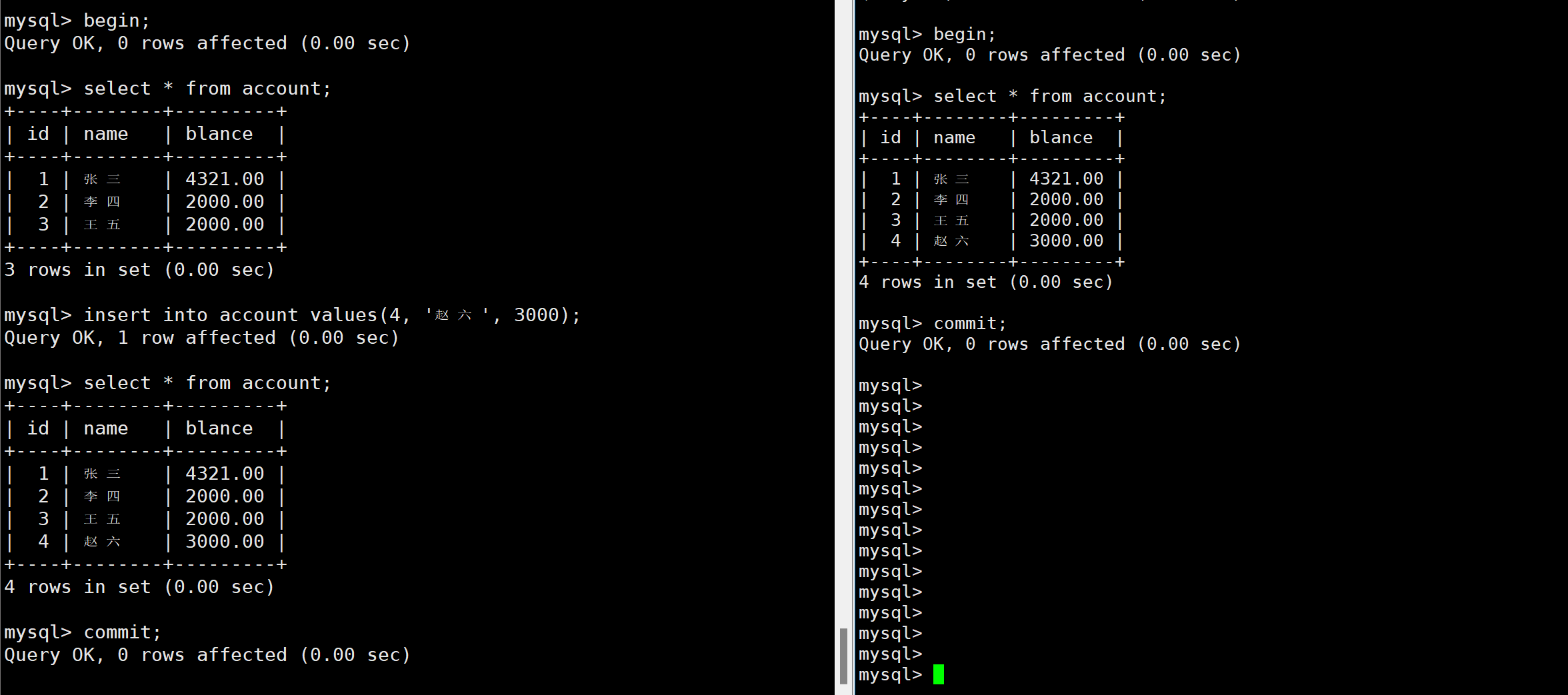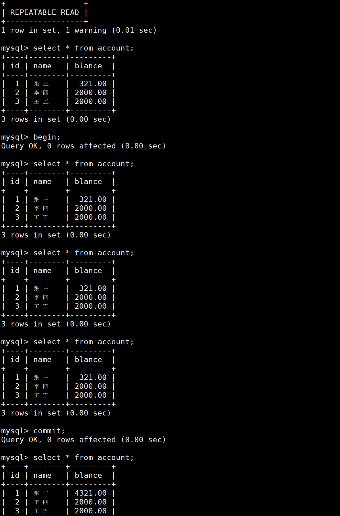 设置隔离级别为Repeatable Read,终端A和B先后分别开启事务,然后终端A插入一条数据,然后提交事务。此时终端B的事务查询account表,却发现能看到终端A事务新增的数据。