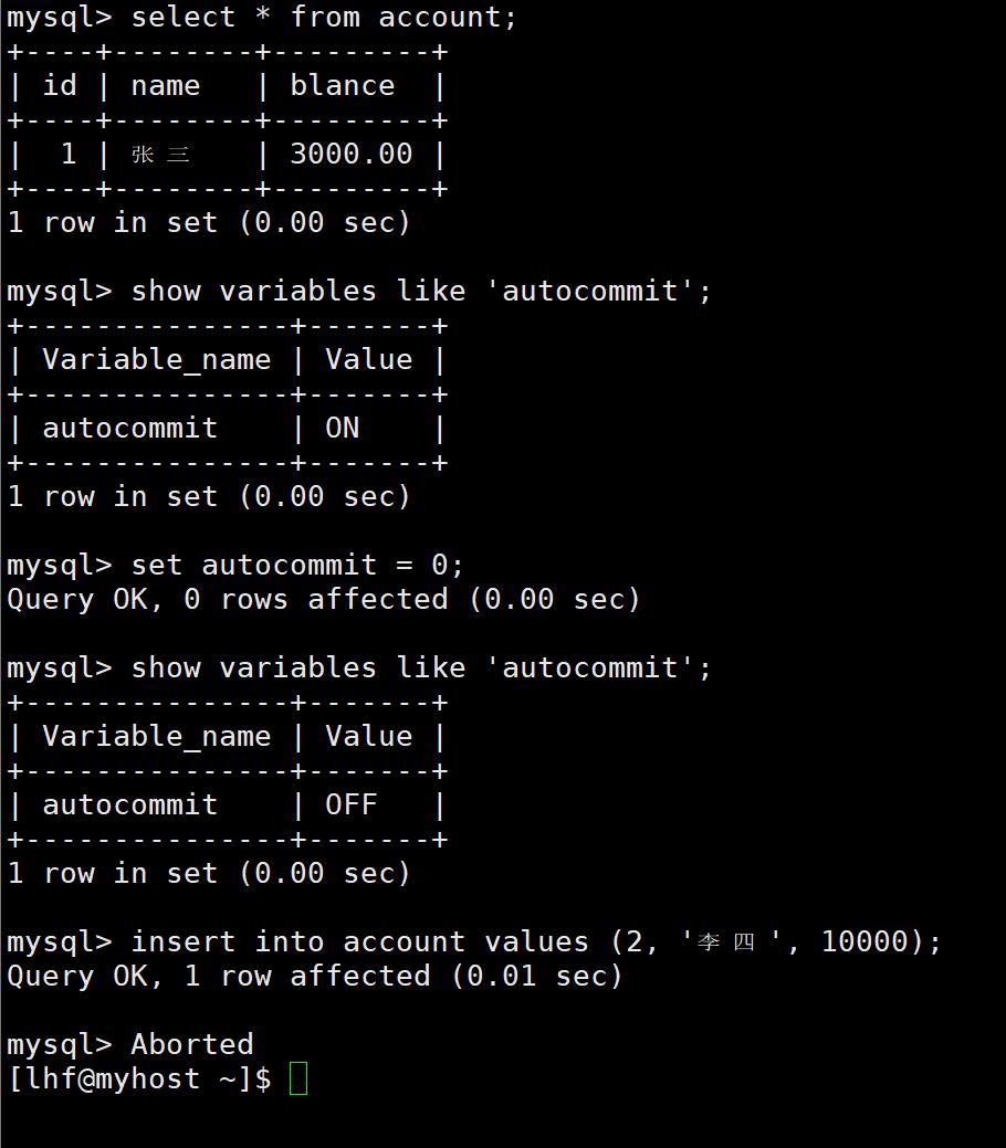 终端A,关闭事务的自动提交,执行单条SQL,然后提交事务,最后终止终端: